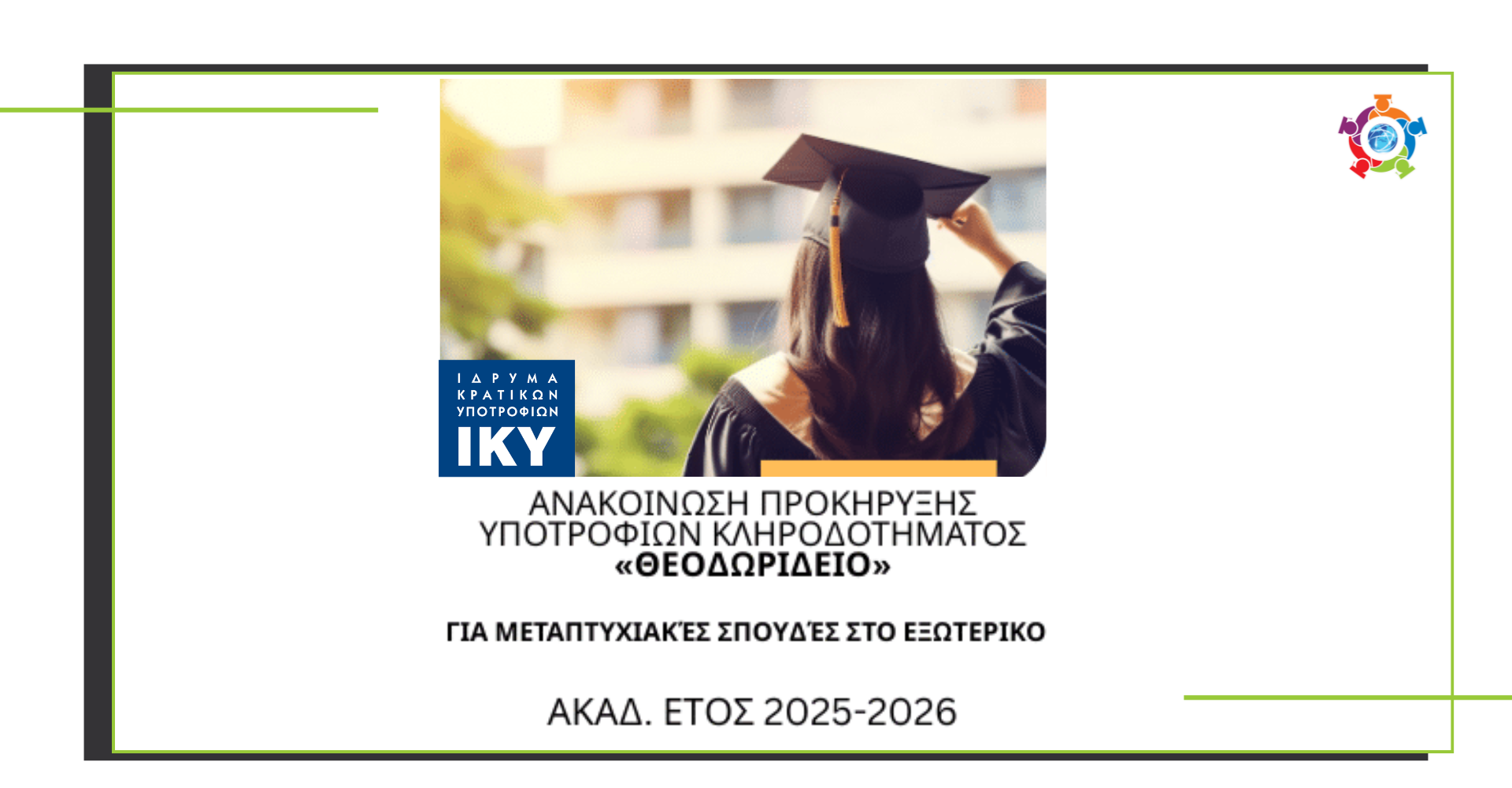 Το Ίδρυμα Κρατικών Υποτροφιών προκηρύσσει έξι (6) υποτροφίες με διαγωνισμό για μεταπτυχιακές σπουδές στο εξωτερικό, στον τομέα των Επιστημών της Αγωγής, από τα έσοδα του «Θεοδωρίδειου Κληροδοτήματος Εκπαιδευτικών» για το ακαδημαϊκό έτος 2025-2026.